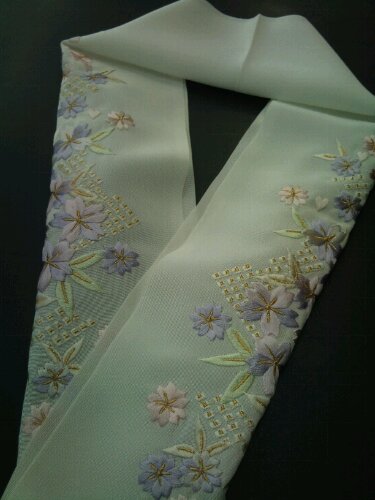 こちらも淡い色目に花びらの刺繍をほどこしてあります。先程の帯〆と組み合わせて使っていただいても素敵です♪